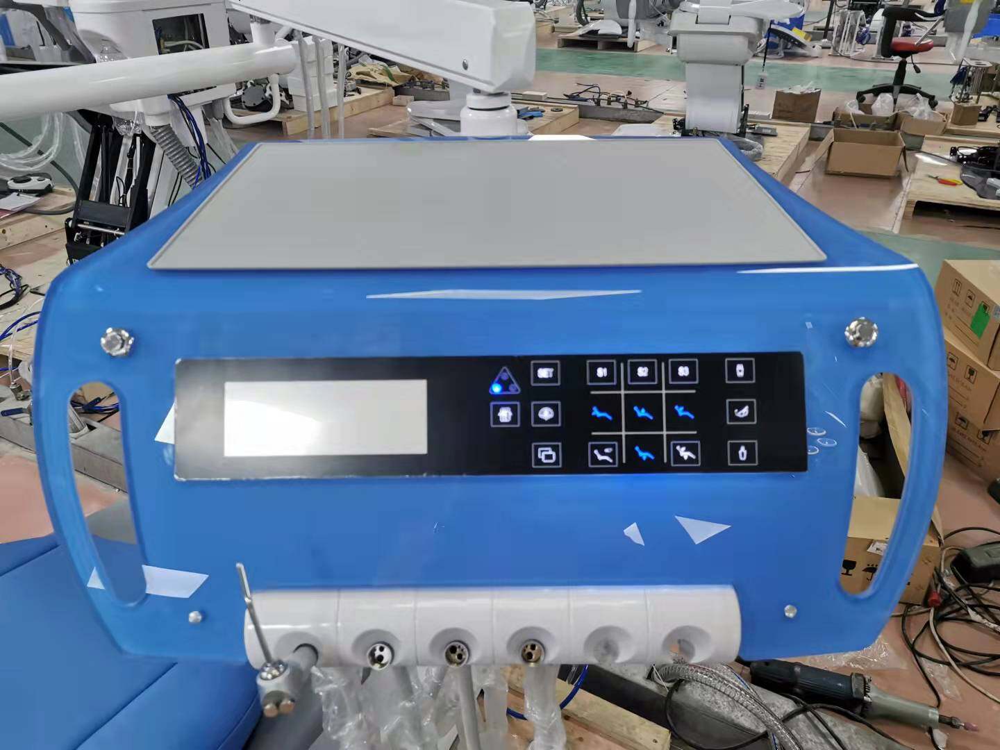 New design double armrest 1 set; New design down tray with acrylic material with touch control 1 set; With autoclavable silicone pad,maximum bearing temperature is 135-degrees 1pcs; 6-posistion for handpieces ,syringe, scaler and micro motor 1set; Suction and saliva ejector 1 set each; LED operation lamp with sensor(white and yellow light) CX-206 1 set; American style lamp arm 1set; Build-in model Lcd X-film viewer 1 set; 24V DC LINAK motors from Denmark 1 set; Assistant tray with acrylic material with touch control 1 set; Water purified system 1 set; Water heating system 1 set; Water bottle 1000ml 1 pcs; Auto water supply and flush cuspidor system 1 set each; Fixed ceramic cuspidor 1 set; Acrylic material table 1set; Multi-function foot pedal CX-106 1 set; Big size dentist stool with double adjust CX-147 1 piece; Micro-fiber leather cushion 1 set; Solenoid valve CX-097 2 pcs; ABS plastic covers 1 set; USA air and water tubes 1set; All kinds of copper valves 1set; Chair with 9 memories positions 1set; With low water alarm function 1set; Chair without safety system; Linked movement chair frame; New base(steel paste with strong PU cover); Packing size: 170*115*125CM; Gross Weight: 260KG.